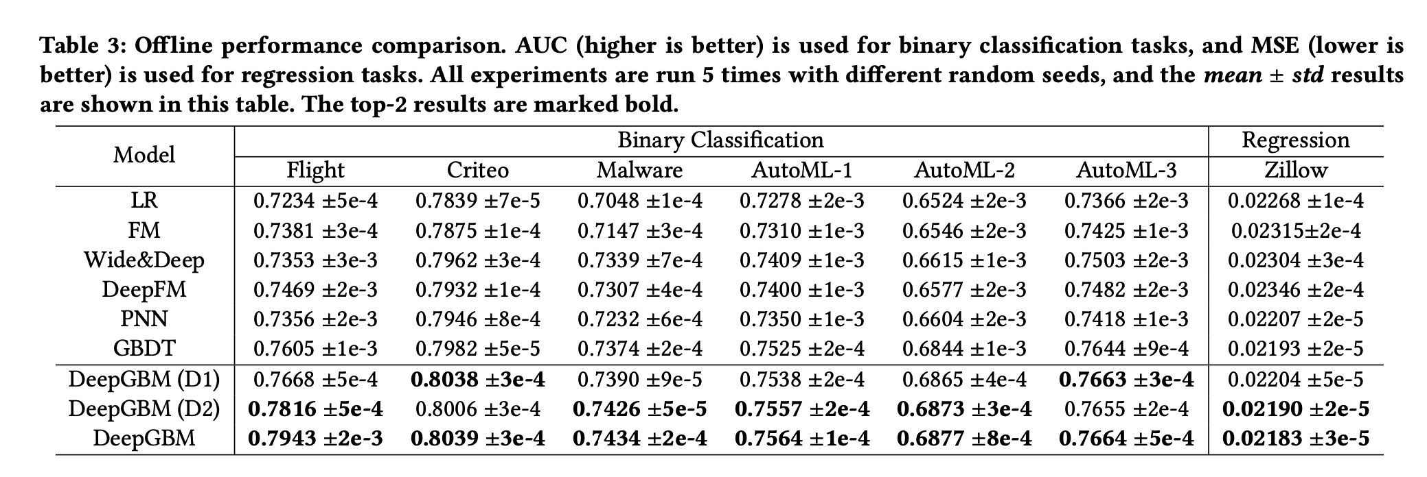 本文主要提出了DeepGBM模型,来整合NN与GBDT的优势,支持sparse特征和dense特征,并且是end2end的训练流程,也适用于online training。经过实验,该模型在常见的数据集(如Criteo等)上取得state-of-art的效果。