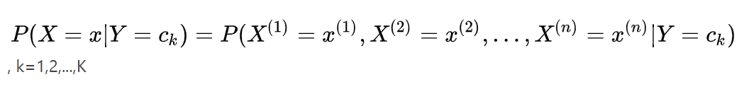 形式化描述为,针对一个给定n维特征输入X 其类别Y可能的属于c1,c2,c3......ck 先假设各个特征之间相互独立