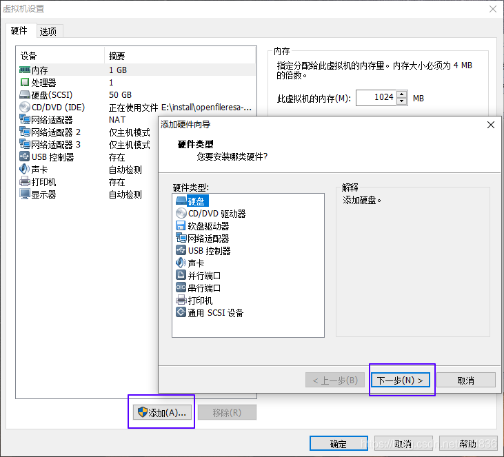 在你的openfiler虚拟机编辑上增加一块硬盘,记住要先关闭虚拟机;