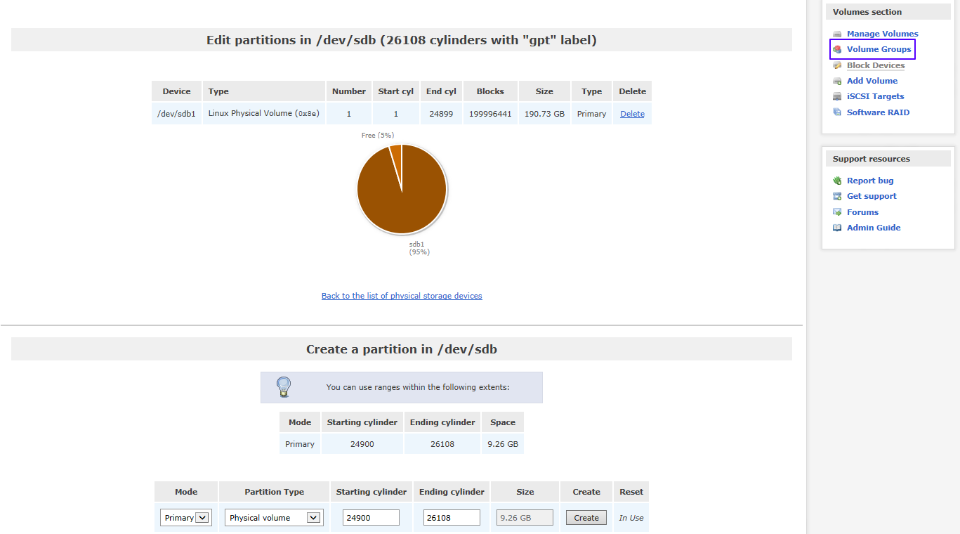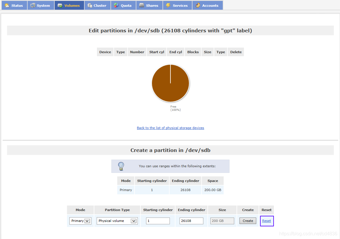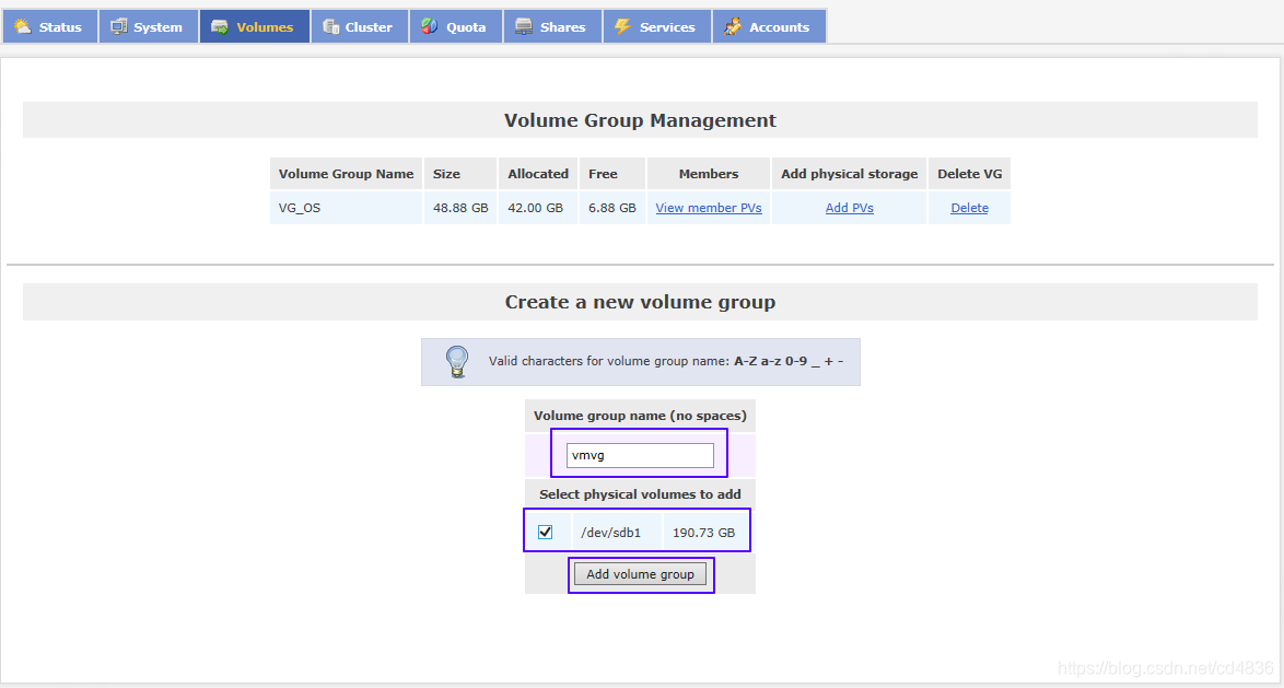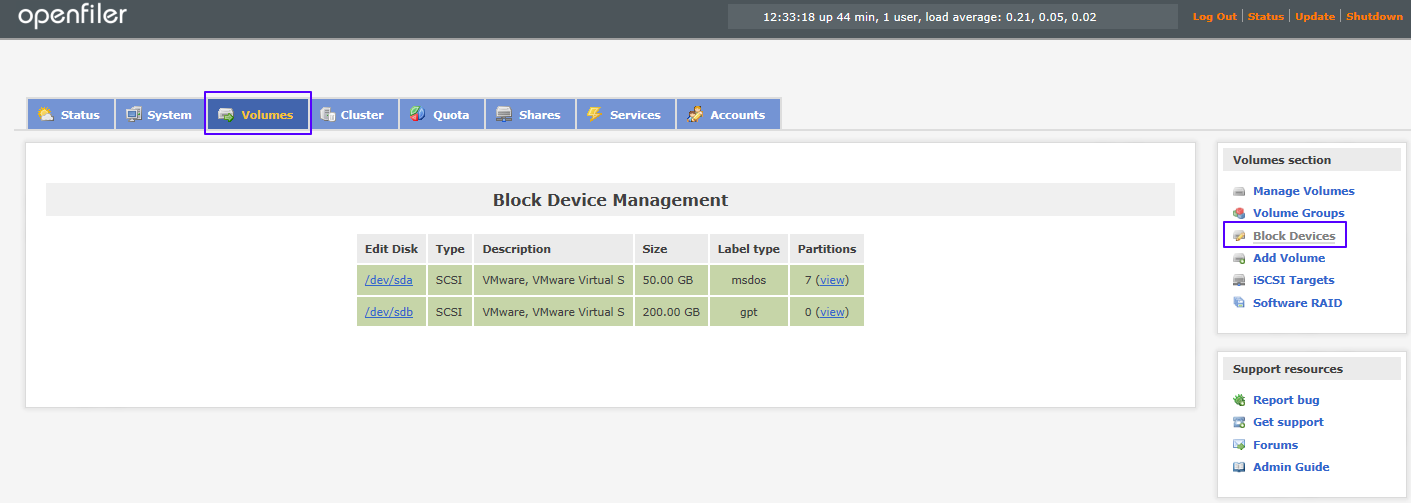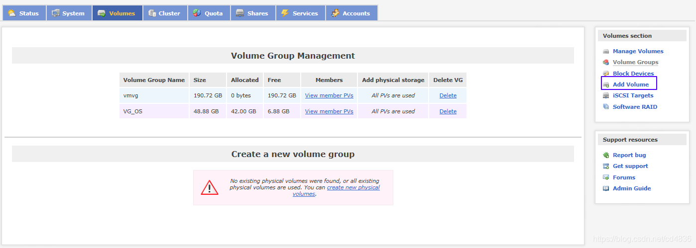 下面你就可以一步一步创建的OpenFiler下的VG,通过OpenFiler提供的浏览器图形工具,在你登录后,点击Volumes标签