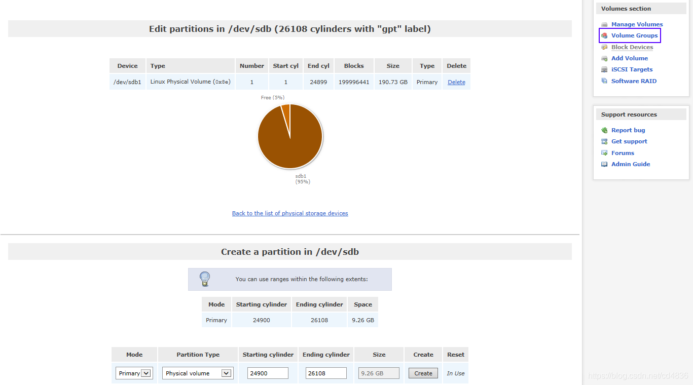 点击右方的Block Devices,可以看到添加的磁盘,点击/dev/sdb;