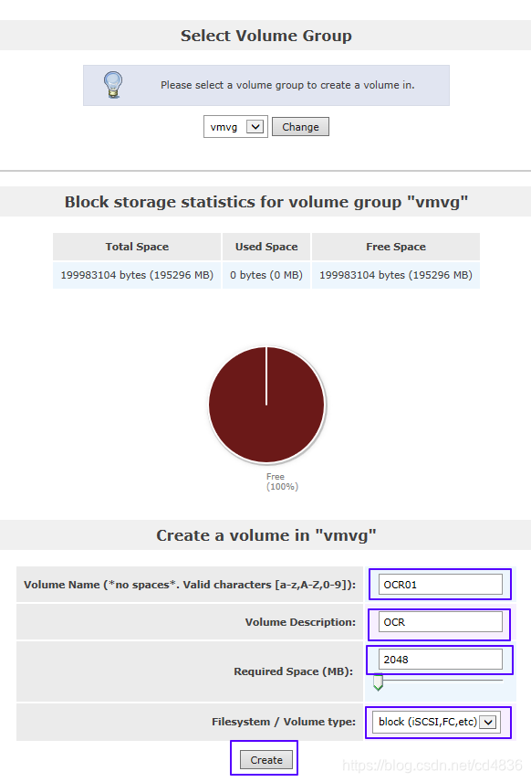 输入内容,调整磁盘大小为2G,卷类型选择block(iSCSI,FC,etc),点击Create,创建逻辑卷;