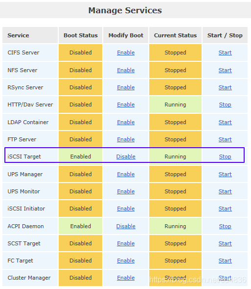 点击Services标签栏设置iSCSI Target 为Enable 开启服务Start,可以理解为通过iSCSI在一定的网络中公布这些LUN;