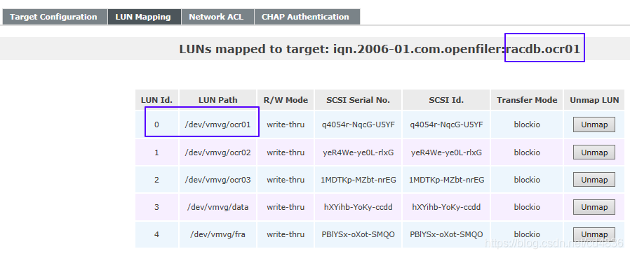 选择LUN Mapping标签,将0 /dev/vmvg/ocr01点击Unmap;
