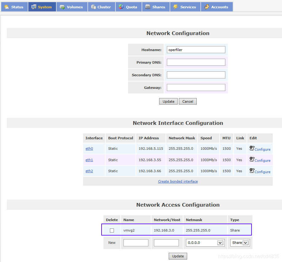 进入左上角的System,并且直接拉到页面的下方。在Network Access Configuration的地方输入这个网络访问的名称,如vmvg2(这个名称可以随便取)。输入主机的IP段。注意不可以输入单一主机的IP,这样会都无法访问。我们在这边输入192.168.3.0,表示从192.168.3.0这一个网段都可以访问。在Netmask中选择255.255.255.0,并且在Type下拉列表框中选择Share,之后即可以单击Update按钮;