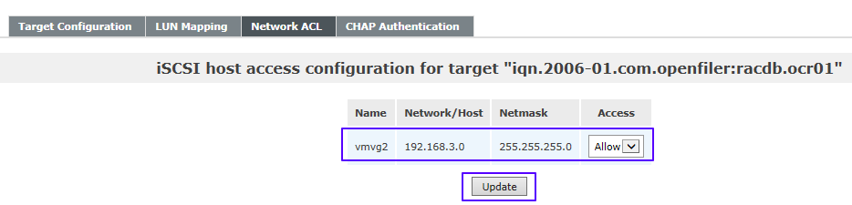 选择Volumes,选择iSCSI Targets,选择Network ACL,把vmvg2这个网段的Access设置改成Allow,然后Update,反复操作另外4个iqn.2006-01.com……