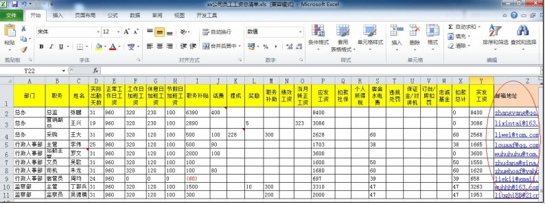 第一步:当然你有一份已经制作好的全公司的Excel格式工资总单,如下图:《xx公司员工工资总清单.xls》,如下图1.1,第一行为标题行,用来说明每项数值名称,最重要的一点,每行都有一个与之对应的邮箱地址。