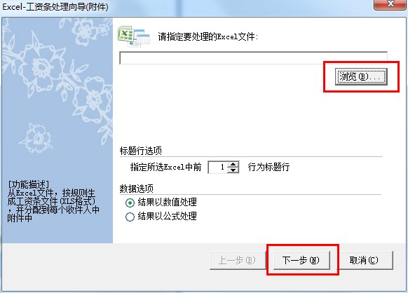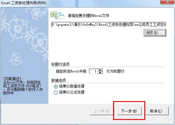 第二步:点击GoGoMail主界面的 Excel-工资条处理向导(附件),会弹出Excel工资条处理向导对话框,如图1.2