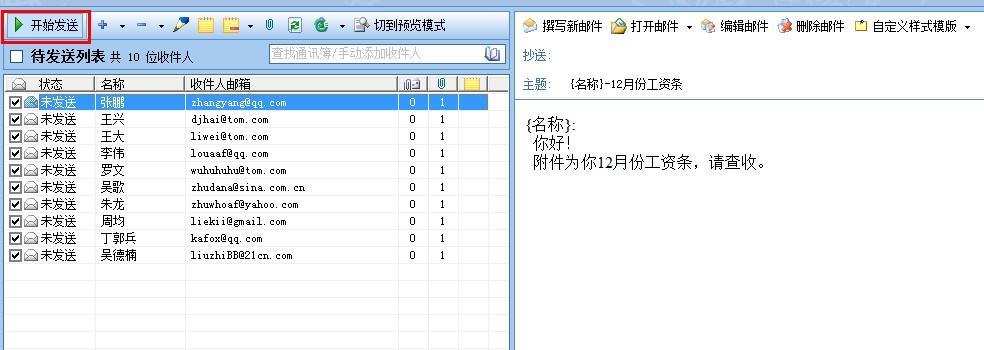 第十二步:现在我们就可以点击,开始发送了,就完成了整个工资条的快速分发。