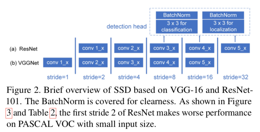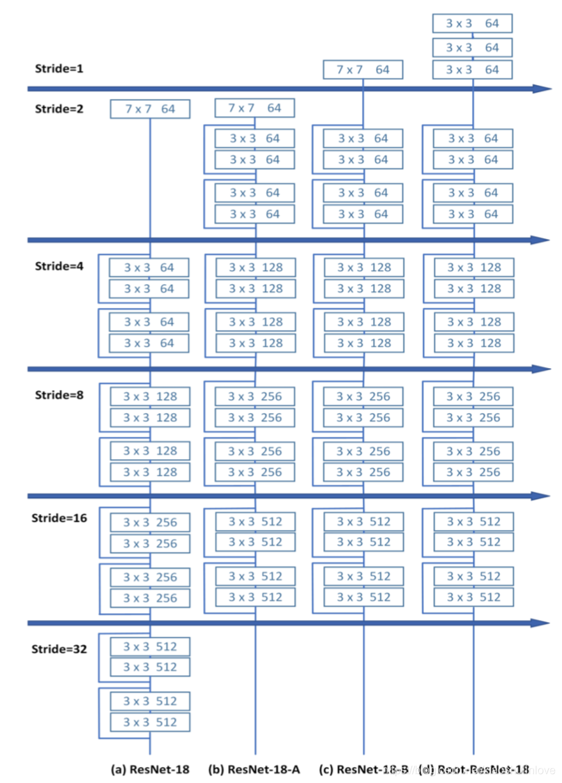 网络:(a) ResNet-18:原始结构。(b) ResNet-18-A:删除第一个最大池层。(c) ResNet-18-B:将第一个conv层的步幅大小从2更改为1。(d) Root-ResNet-18:将ResNet-18-B中的7×7conv层替换为3×3conv层,PASCAL 2007测试(从头开始的“07+12”训练)的对应图分别为73.1%、75.3%、77.6%和78.5%。值得注意的是,无论我们如何修改结构,我们选择的检测层的空间大小与SSD300和DSOD300相同(即38×38、19×19、10×10、5×5、3×3、1×1)。