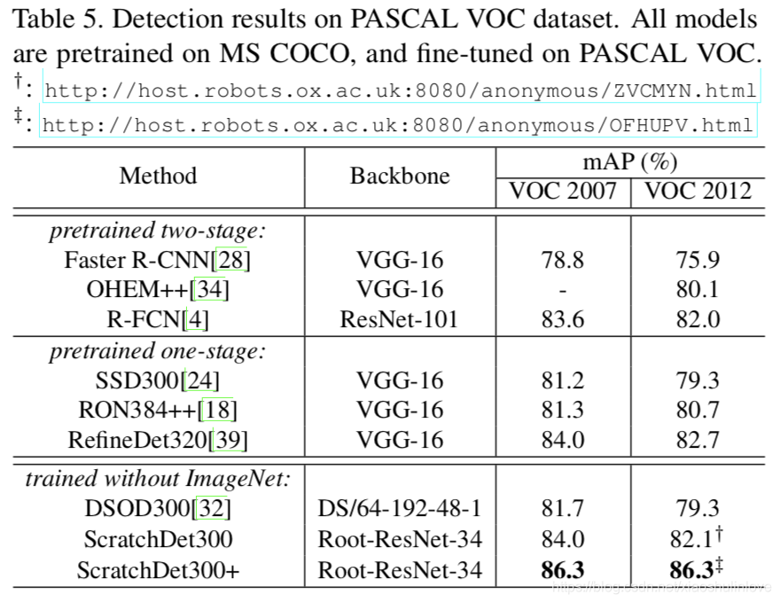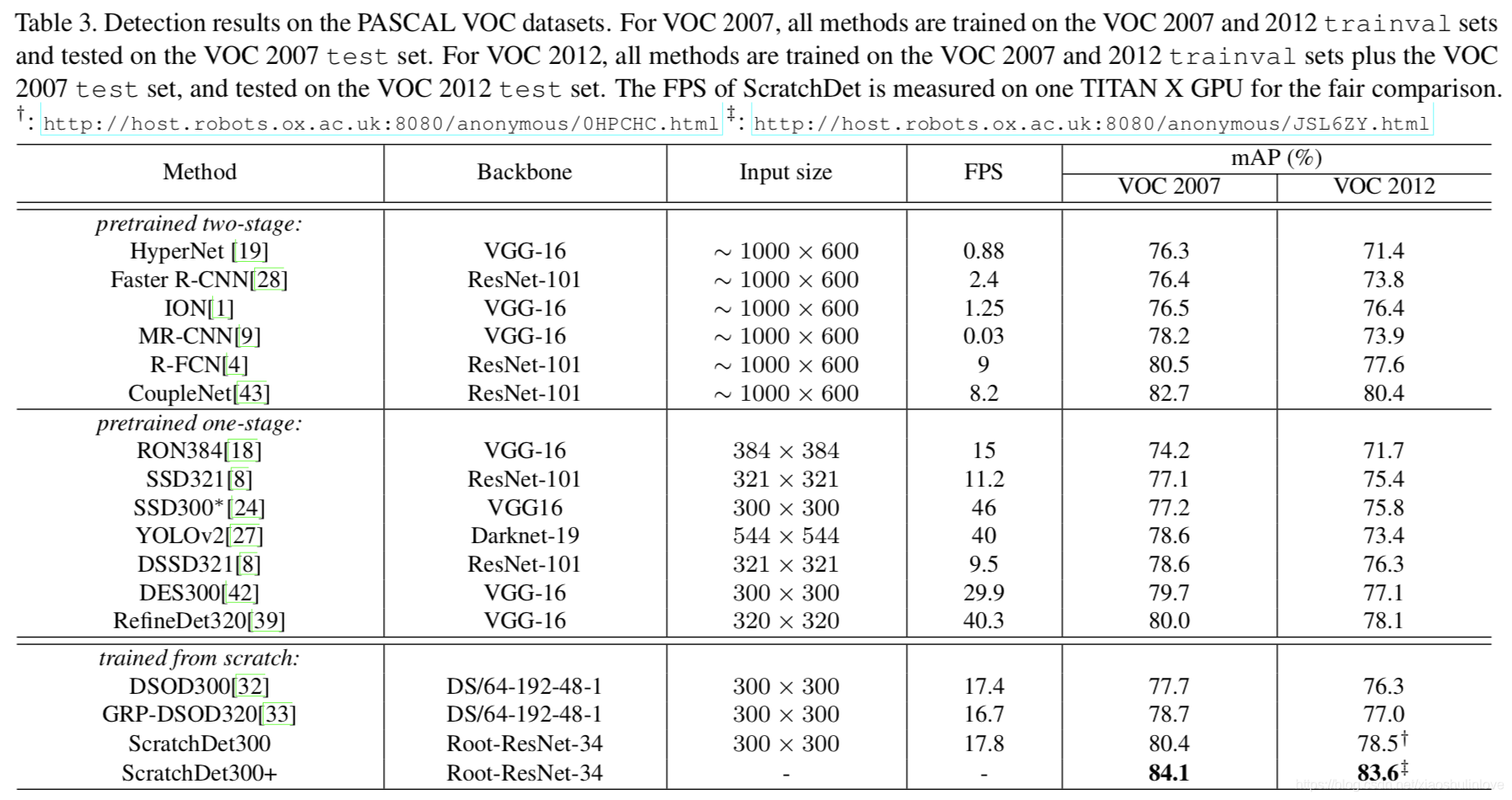 我们的ScratchDet在所有从头开始的训练检测器中,在PASCAL VOC 2007、2012和MS COCO上都达到了最先进的精度,甚至比几种一级预处理方法性能更好。