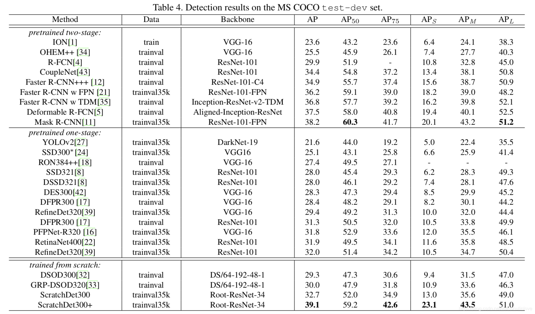 (3) ScratchDet的性能优于最先进的从头开始的训练检测器和一些基于预训练的检测器。