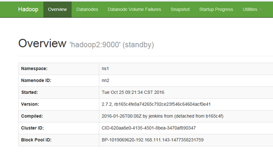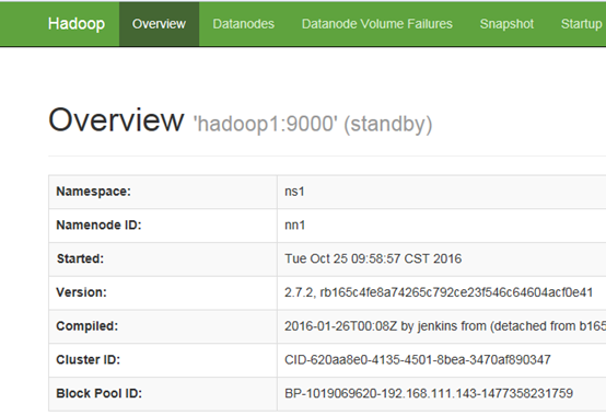杀掉当前状态为active的hadoop1 的namenode进程,可以看到hadoop2由standby变为active,再启动hadoop1的namenode则发现hadoop1的状态为standby