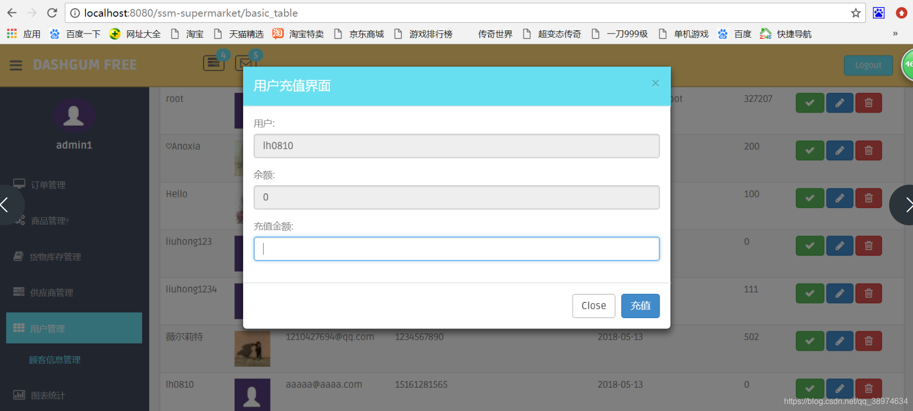 11.管理员为用户充值界面 ,因为想使用第三方支付平台,但是需要一些审核流程,所以暂时只能是管理员充值。 如下图: