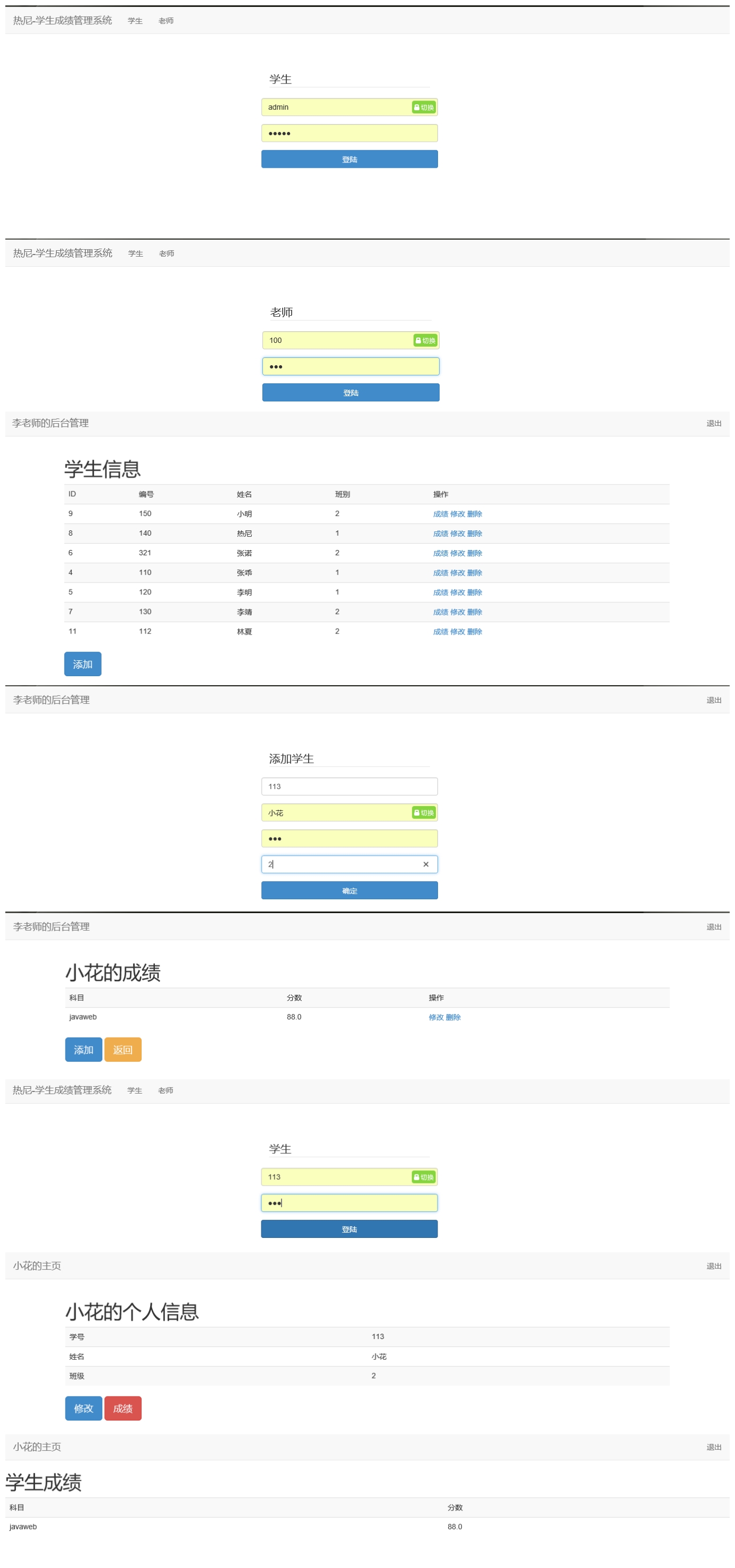该项目采用JavaEE+MySQL进行开发。系统分为教师端和学生端,在教师端 系统中,教师可以对学生信息进行新增编辑删除,对学生成绩信息进行录入;在 学生端,学生登录系统后可以查看自身基本信息,并对自身成绩进行查询。下载地址:http://www.hrxxkj.com/webpage/928361415