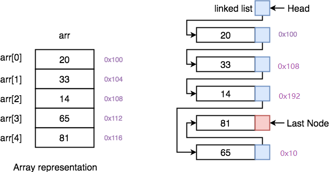 将数组和链表放在一起看,可以发现,链表的内存地址不一定是连续的,系统不会预先分配给链表指定大小的内存空间。当向链表中存放数据,系统会寻找未使用的内存块,存放数据,然后把前一个节点的指针指向该内存。