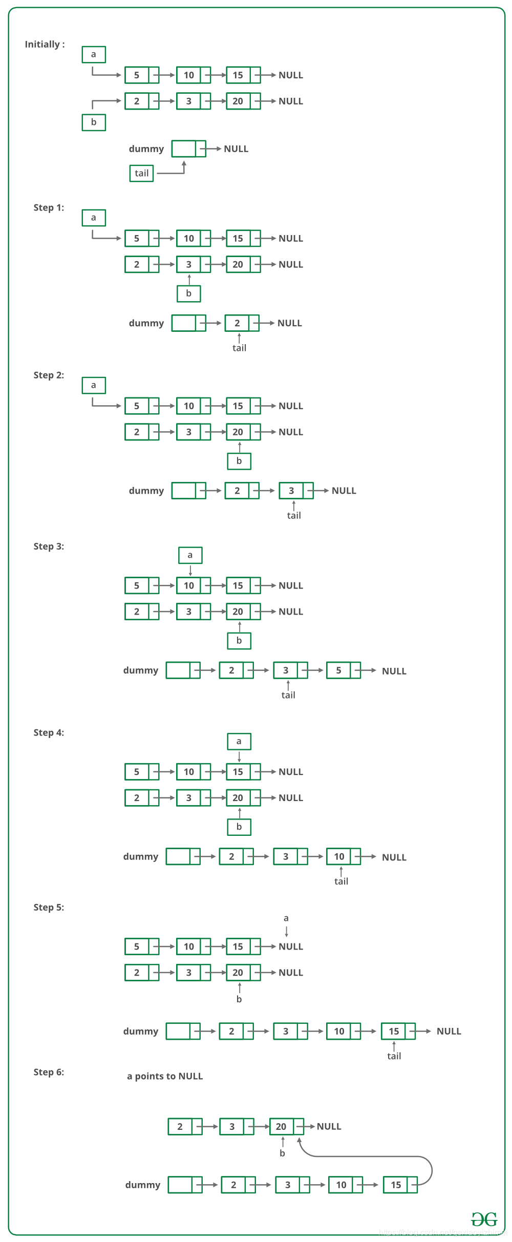 用两个指针a,b分别指向两个链表的头结点,然后比较,选择较小的节点,同时向后移动该指针。直到某个链表元素取完。最后将另一个剩余的元素拼接到最后的结果,就完成了合并。