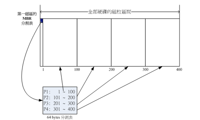 这四组划分信息称为主要分区或扩展分区(Primary 和Extended),分区的最小单位为柱面(所有磁片上的同一个磁道组成一个柱面)。