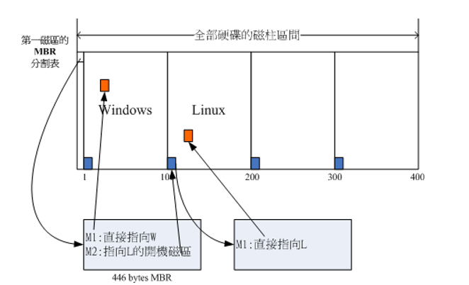 如第一个MBR中的boot loader指向Windows内核文件或Linux中的启动扇区中的bootl oader