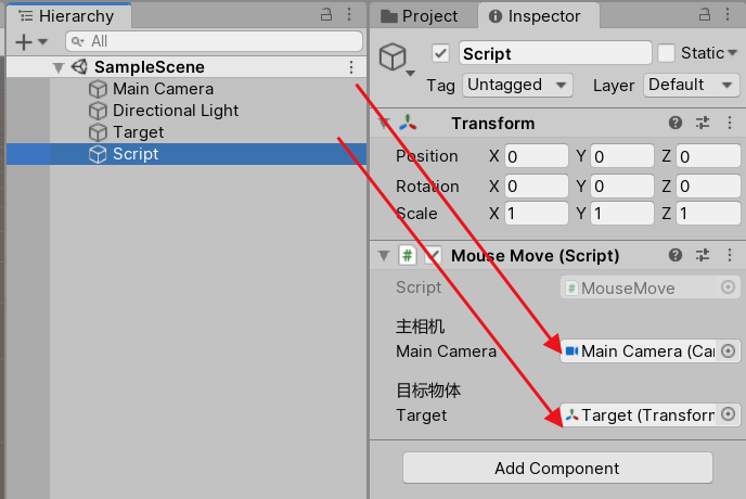5.新建一个空物体Script,并将MouseMove.cs脚本挂载上去,再将相机和Target物体拖拽到脚本上