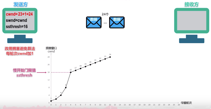 慢启动呈指数增长。达到慢开始门限值之后开始使用拥塞控制算法——线性加1。