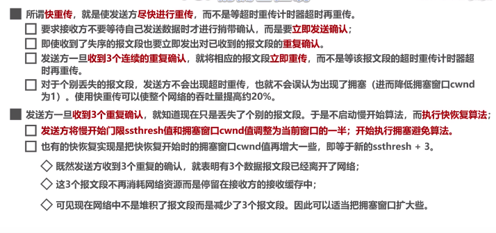- 发送方一旦收到三个连续的重复确认,就将相应的报文段立即重传,而不是等待该报文段的超时重传计时器超时再重传。