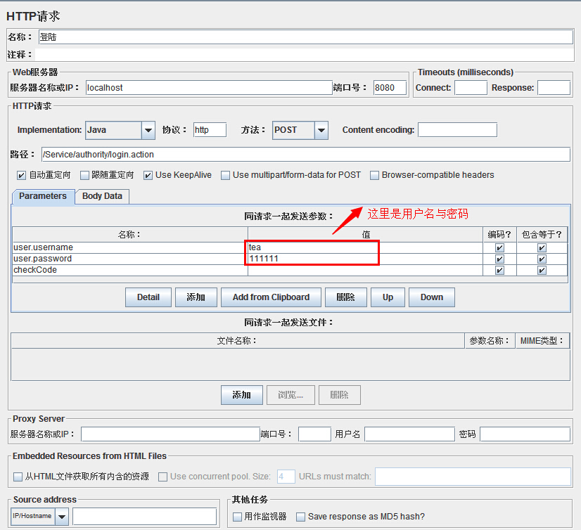 1、录制一个脚本(可以用badboy工具录制),在jmeter中打开,找到有用户名和密码的页面。如下: