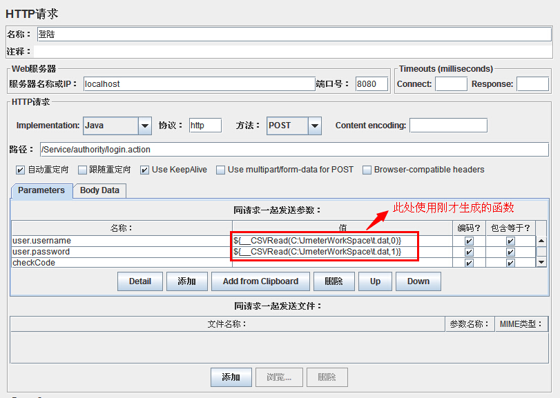 好了,现在我们的参数化设置完成,在脚本的时候,会调用我们C:\JmeterWorkSpace盘下面的t.dat文件,第一列是用户,第二列是密码。