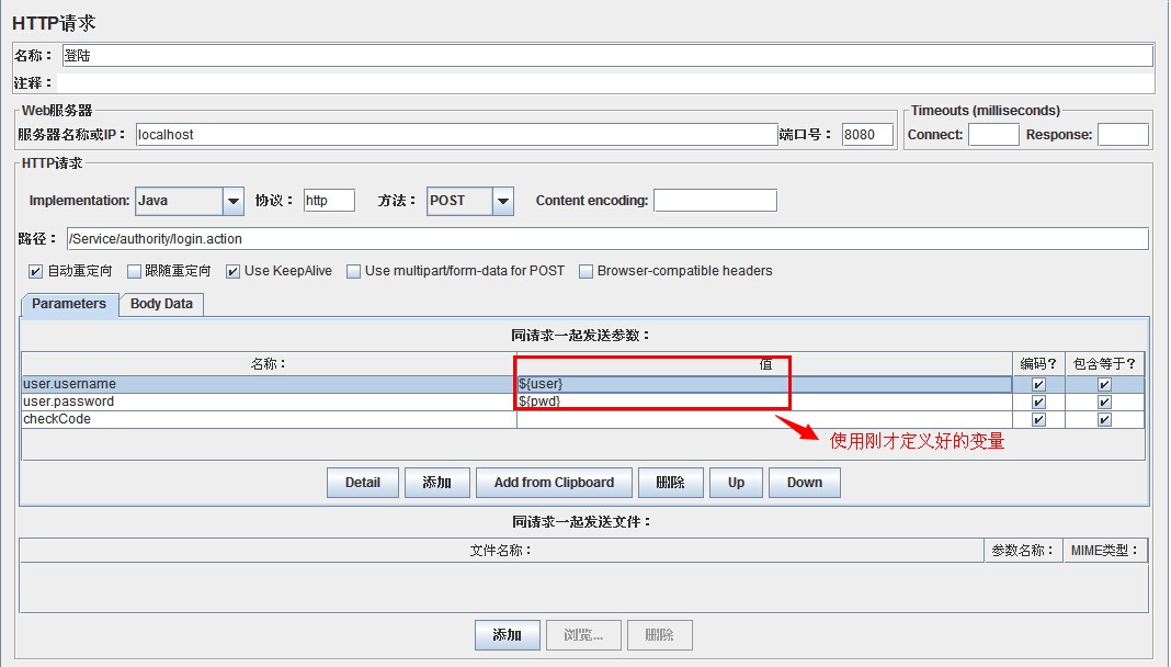 这个时候就需要对用户名和密码进行参数化,使每个虚拟用户都使用不同的用户名和密码进行访问。