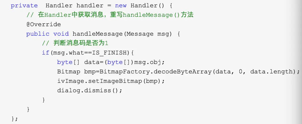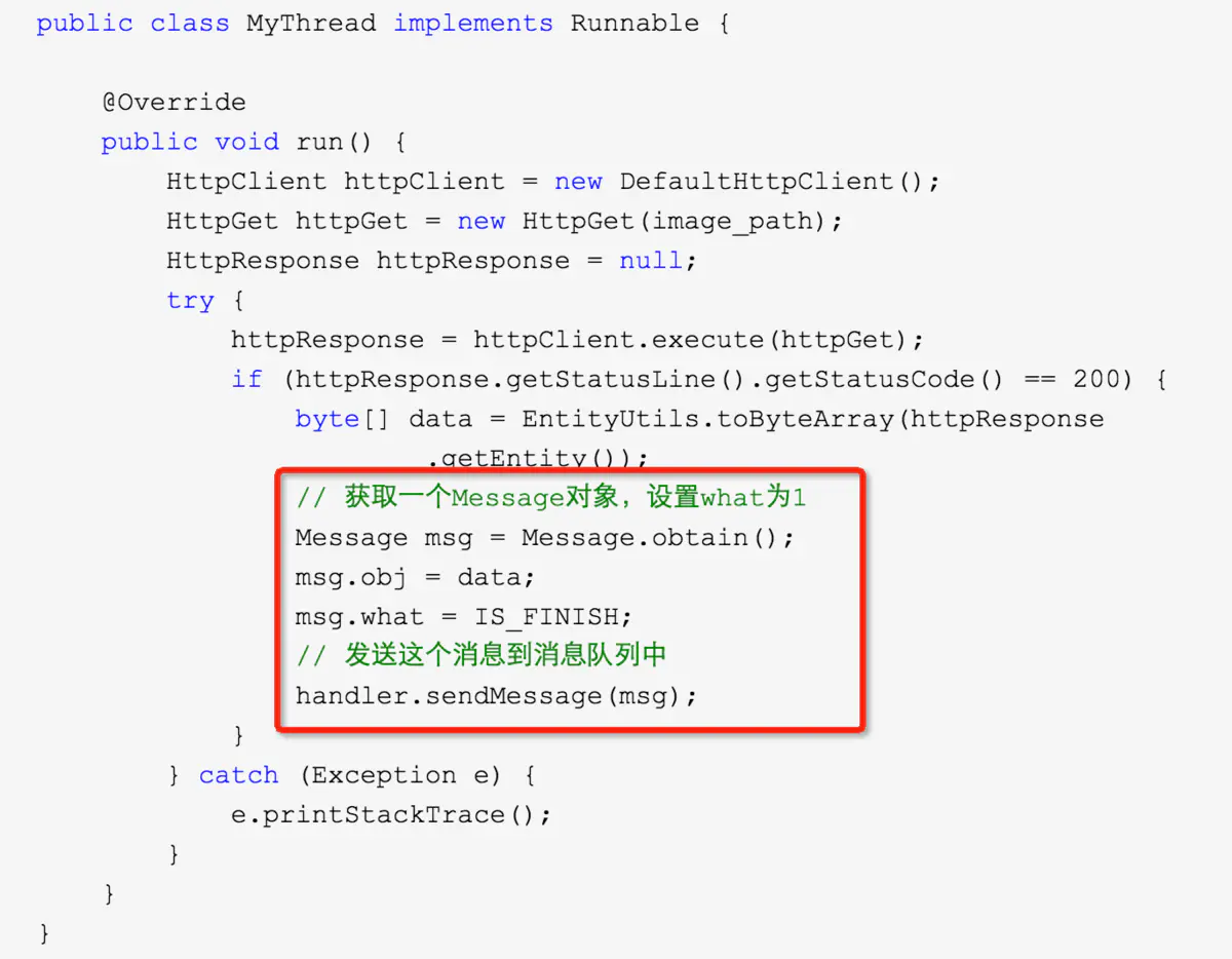 Handler如果使用sendMessage的方式把消息入队到消息队列中,需要传递一个Message对象,而在Handler中,需要重写handleMessage()方法,用于获取工作线程传递过来的消息,此方法运行在UI线程上。Message是一个final类,所以不可被继承。