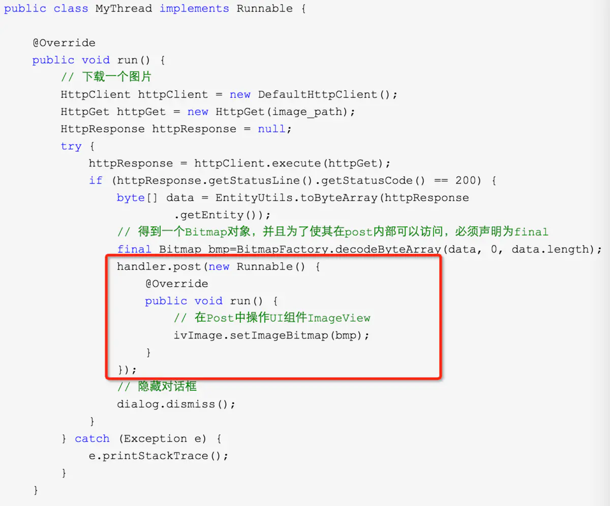 对于Handler的Post方式来说,它会传递一个Runnable对象到消息队列中,在这个Runnable对象中,重写run()方法。一般在这个run()方法中写入需要在UI线程上的操作。