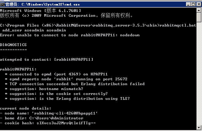 重装,安装RabbitServer之后,运行命令提示: error:unable to connect to node 'rabbit@HAPP11': nodedown