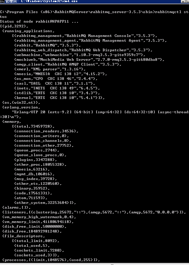 修改确认一致之后, 执行rabbitmqctl status命令检查状态。