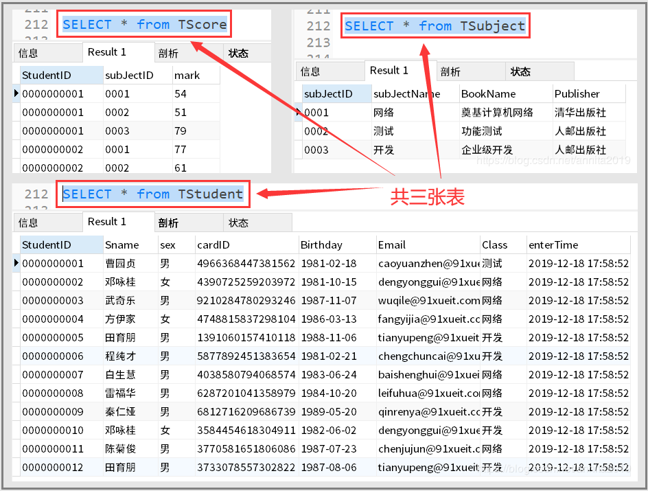 学习环境:共三张表,分别是TScore分数表 ,TStudent学生表 ,TSubject科目表。字段如图: