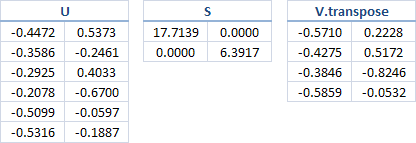 这就是一个矩阵,不过不太一样的是,这里的一行表示一个词在哪些title中出现了(一行就是之前说的一维feature),一列表示一个title中有哪些词,(这个矩阵其实是我们之前说的那种一行是一个sample的形式的一种转置,这个会使得我们的左右奇异向量的意义产生变化,但是不会影响我们计算的过程)。比如说T1这个title中就有guide、investing、market、stock四个词,各出现了一次,我们将这个矩阵进行SVD,得到下面的矩阵: