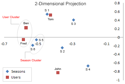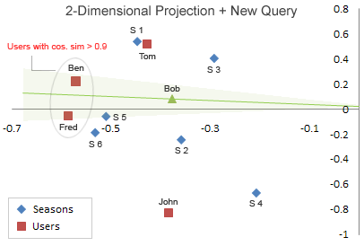我们假设,现在有个名字叫Bob的新用户,并且已知这个用户对season n的评分向量为:[5 5 0 0 0 5]。(此向量为列向量)