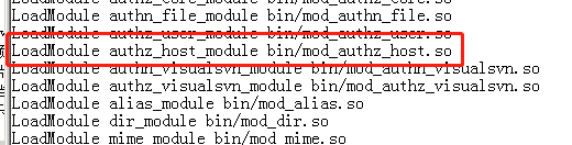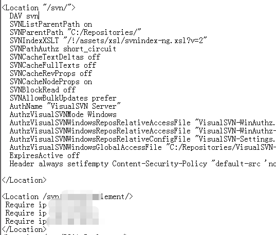 2、在基础SVN目录配置的后面增加内容限制访问。如下图,用马赛克挡住的地方就是需要增加的地方。