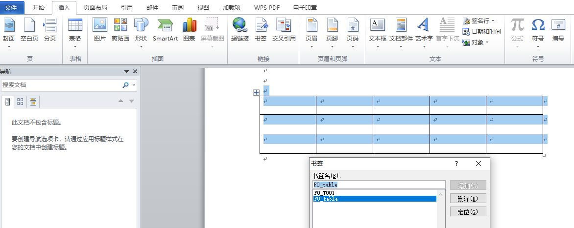 (注:插入书签的时候一定要先选中整个table,然后再点击插入书签按钮进行插入。)