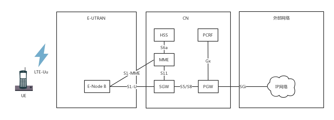 允许接入后,手机直接通过e-Node B连接SGW(数据面接待员),通过PGW(出口网关)连到IP网络