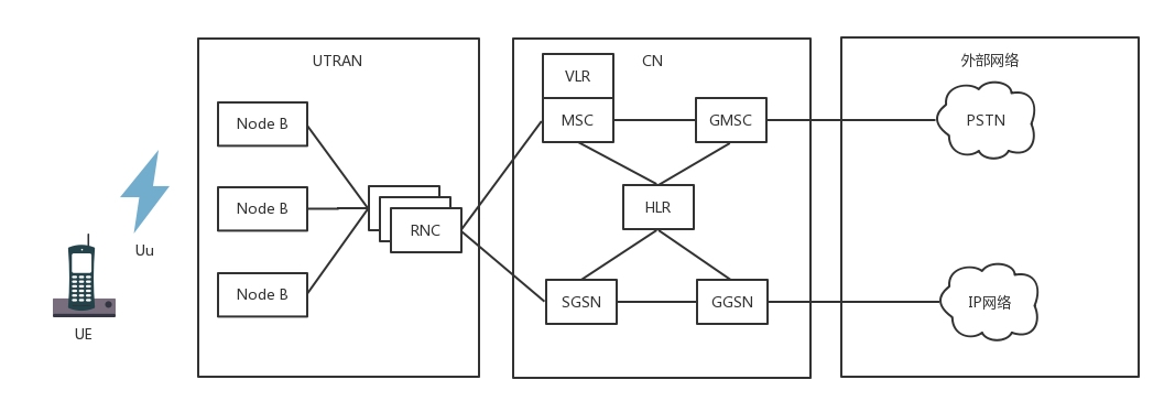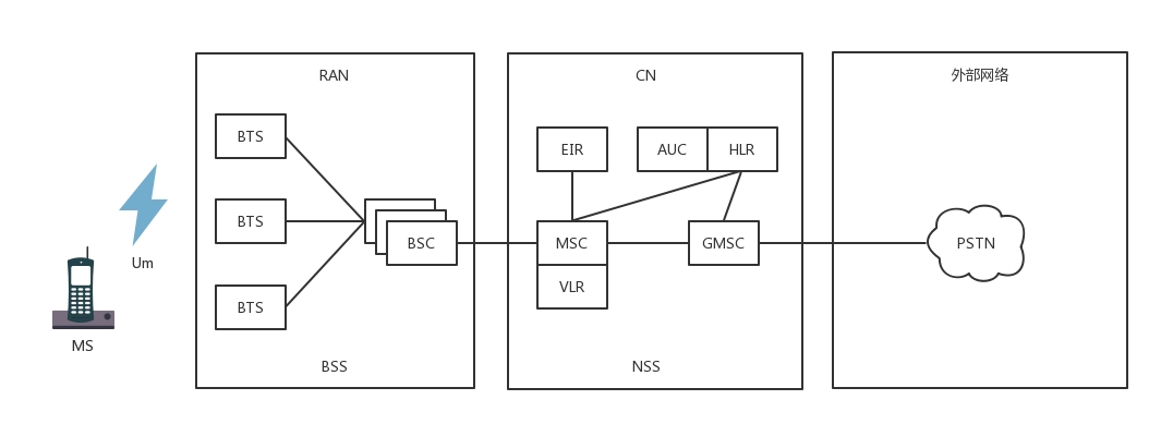 其中:手机是客户端,无线信号的服务端就是基站子系统(BSS),基站子系统分两部分,对外的是基站收发信台(BTS),另一部分对内连接有线网络,叫基站控制器(BSC),基站收发信台通过无线收到数据后转给基站控制器。这部分属于无线的部分,统称为无线接入网(RAN)。