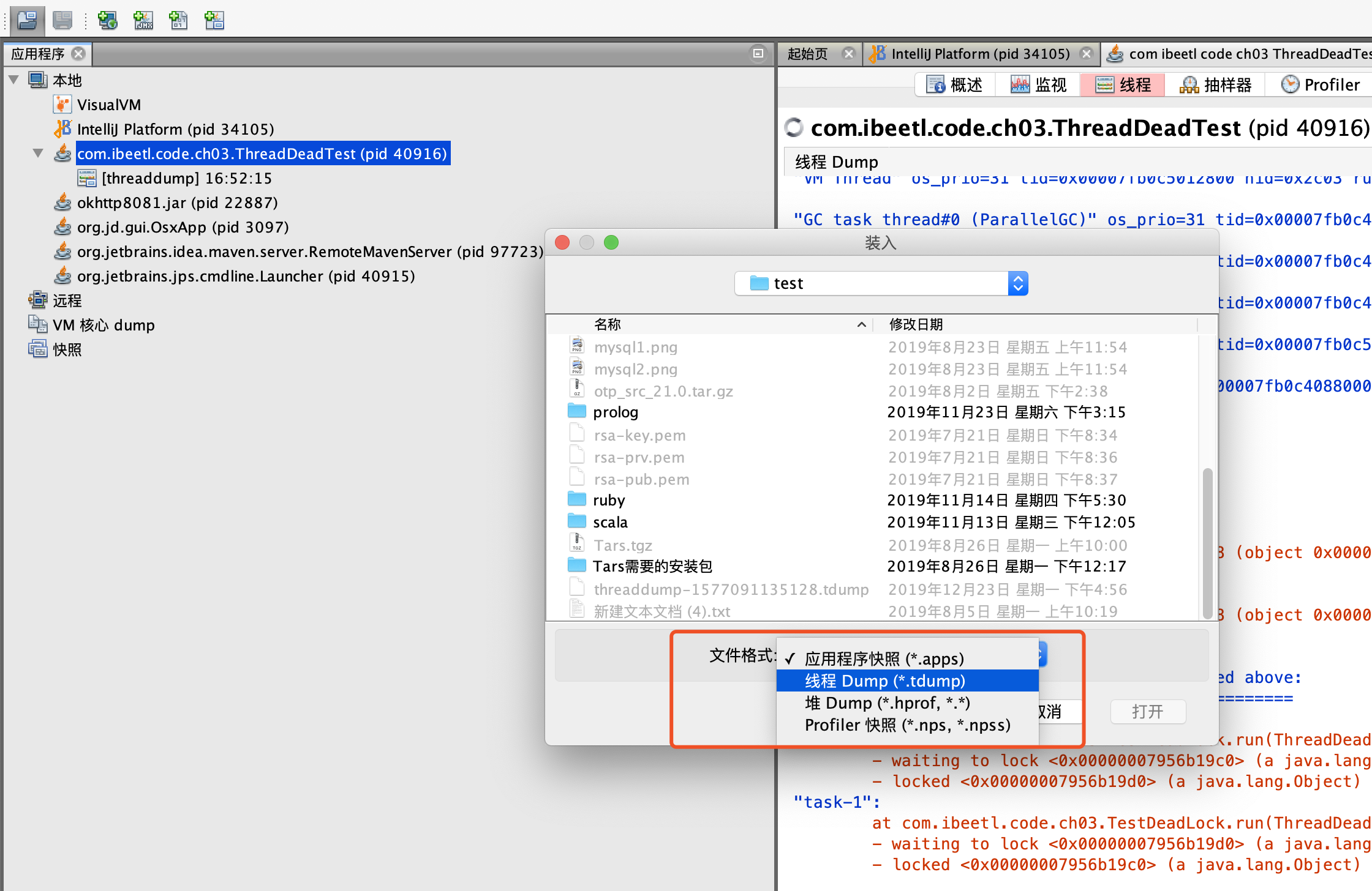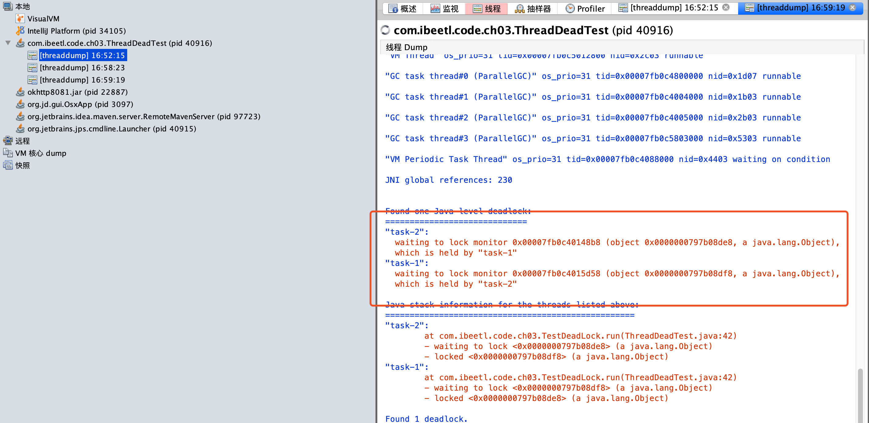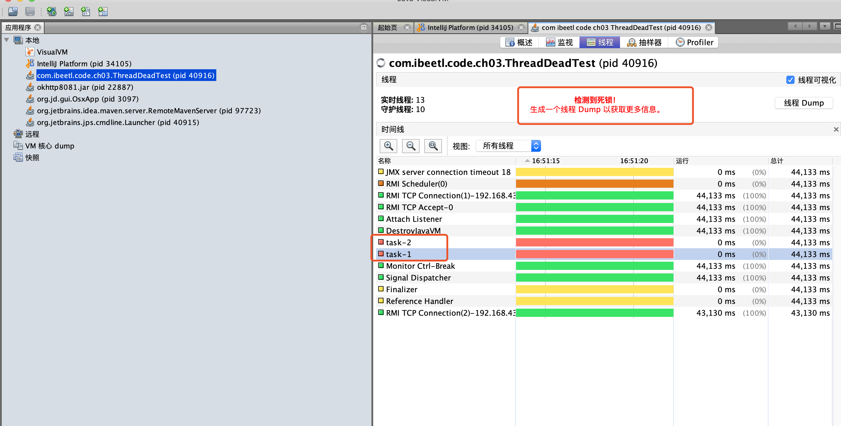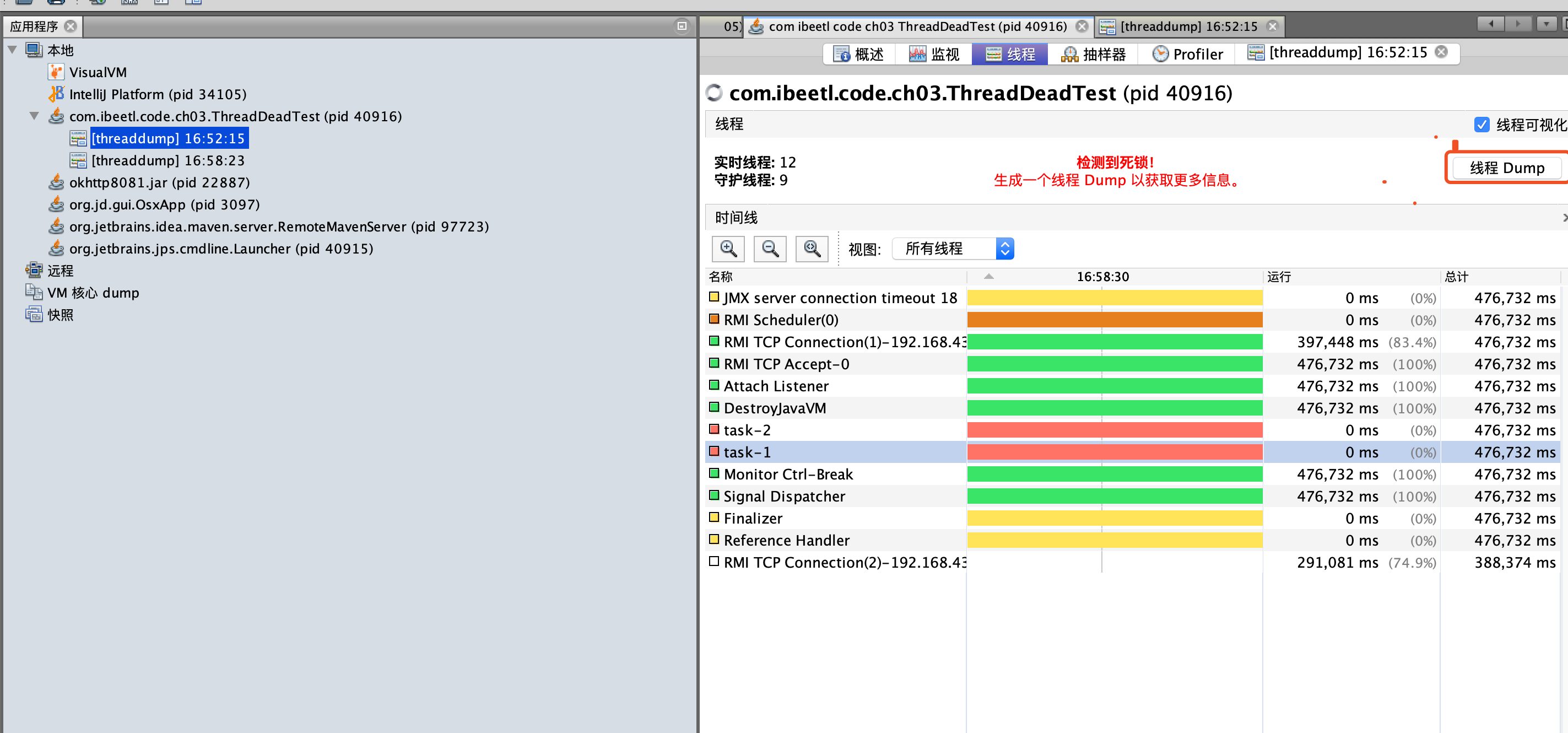 如果是本地项目可以自己模拟出死锁,直接执行jvisualvm查看