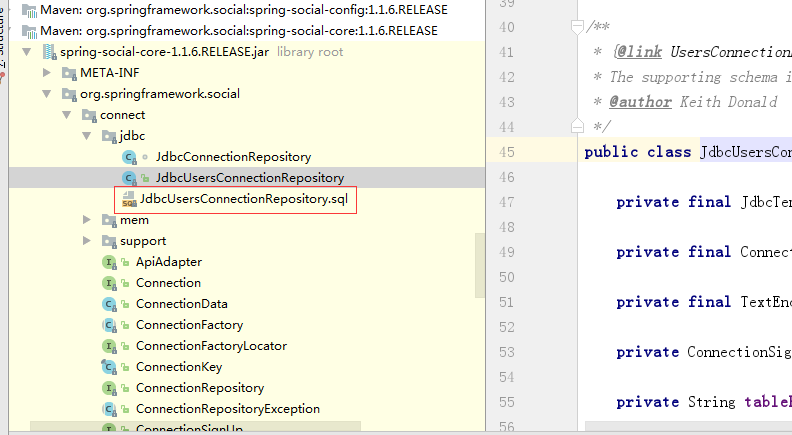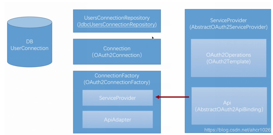 UsersConnectionRepository(JdbcUsersConnectionRepository): 业务系统用户和服务提供商用户对应关系,保存在表UserConnection