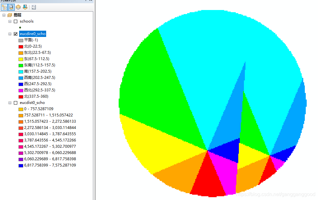 欧氏方向给出每个像元到最近源的方向,如到最近城镇的方向是什么?