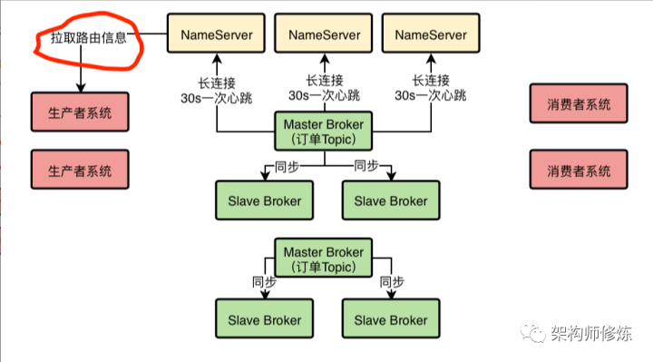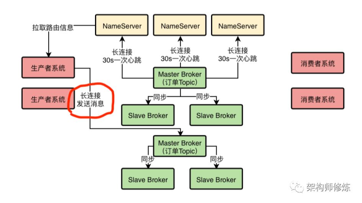 其实,消费者系统和生产者原理是类似的,它们都是会和 NameServer 建立长连接,然后拉取路由信息,接着找到自己要获取消息的 Topic 在那几台Broker 上,就可以和broker 建立长连接,从里面拉取消息了。