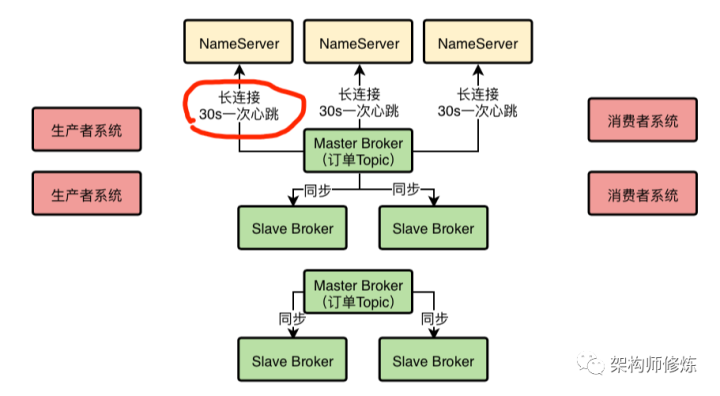 注意:生产者肯定是投递消息到 Master broker 的,然后Master Broker 会同步数据给他的 Slave Broker,实现一份数据多个副本,保证Master故障的时候数据不会都是,同时还可以自动将Slave 切换为 Master 继续提供服务。