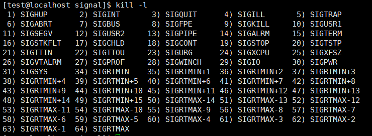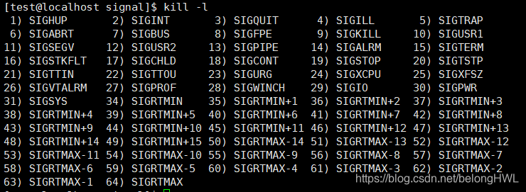 我们可以看到上面有62种信号(32 33 不存在),其中前31种信号是借鉴unix而来的是,每一个均对应一个操作;而后面的信号是面向用户的,并没有对应的事件,所以没有真正的命名。