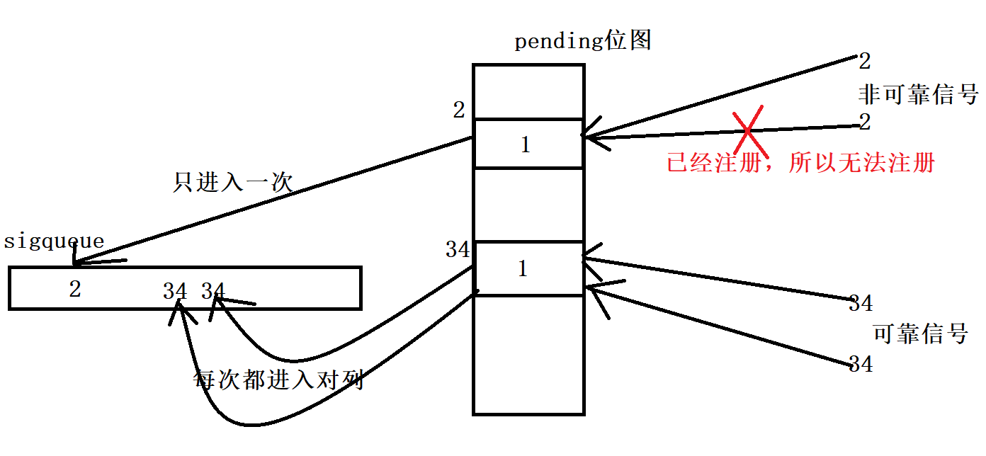 非可靠信号:删除sigqueue节点,直接将pending位图置为0。
