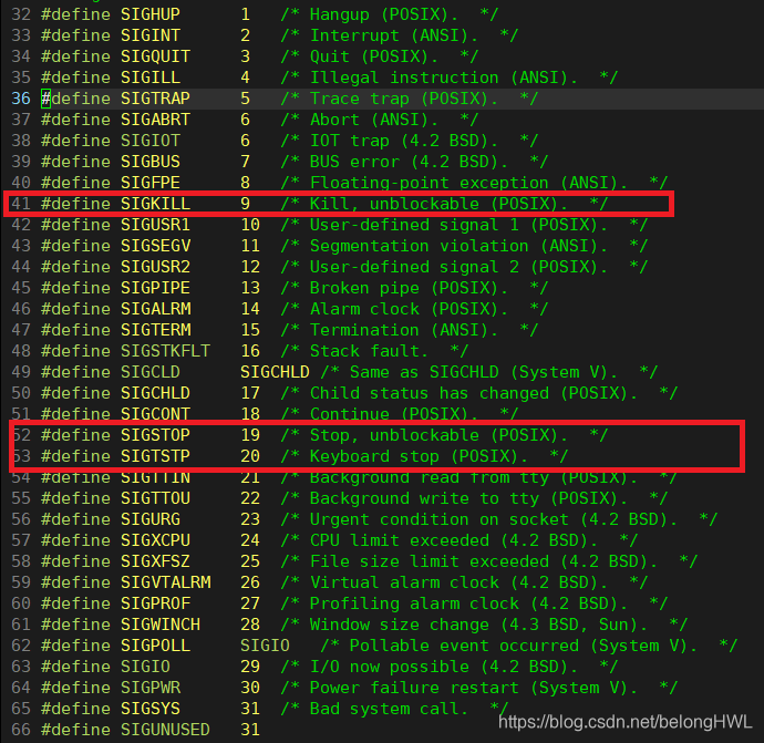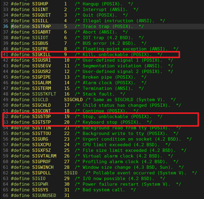 1:查看/usr/include/bits/signum.h文件里的信号信息,你会发现9号和19号信号是不可被阻塞,不可被定义即不可被忽略的。
