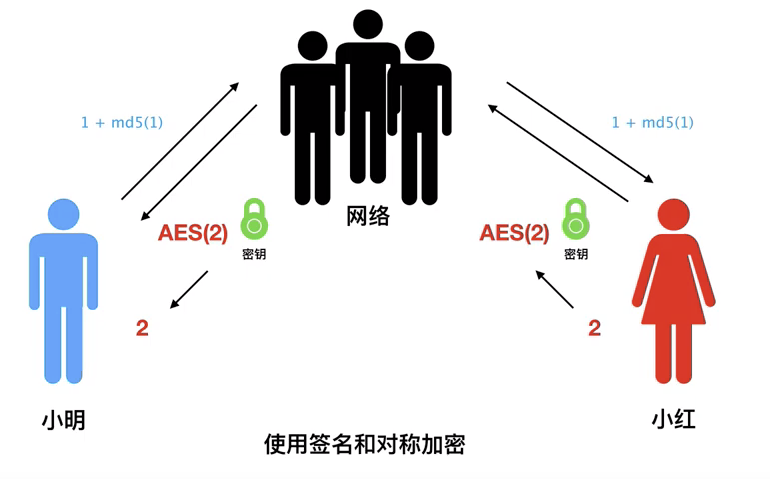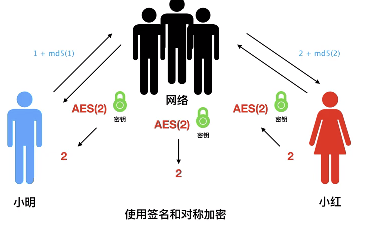内容“1”可以在网络的传输中被篡改成“2”,然后加生成“2”的唯一值,最后小红收到的是“2”和“2”的md5值。小红会认为信息是没有被篡改的。 只要网络中有人获得了他们的秘钥(秘钥需要传一次),就可以对小红发送的消息进行解密。如下图: