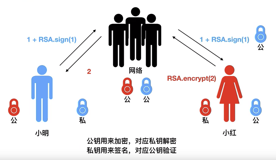 小明用私钥对内容加密,同时将公钥发送到网络中, 小红通过公钥对数据进行解密。返回信息给小明的时候,用小明的公钥进行加密,然后小明通过私钥进行解密。 完成通信流程。